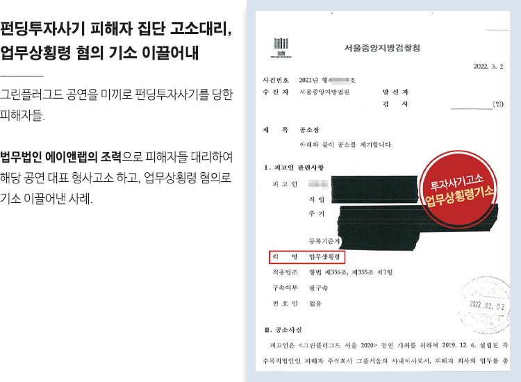 그린플러그드 펀딩투자사기 피해자 집단을 대리, 업무상횡령 혐의 기소 이끌어내