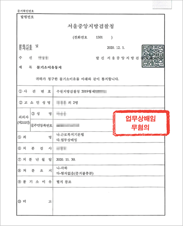 그 결과 검찰은 변론을 전부 받아들이며 근로복지기본법위반 혐의 각하, 업무상배임 무혐의 처분을 내렸습니다.