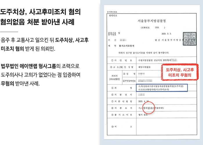 뺑소니(도주치상)혐의 피의자 변호하여 도주의 고의성이 없었음을 입증하고 무혐의 처분