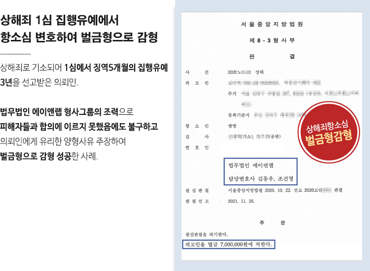 상해죄 1심 집행유예에서 항소심 변호하여 벌금 700만원으로 감형 성공