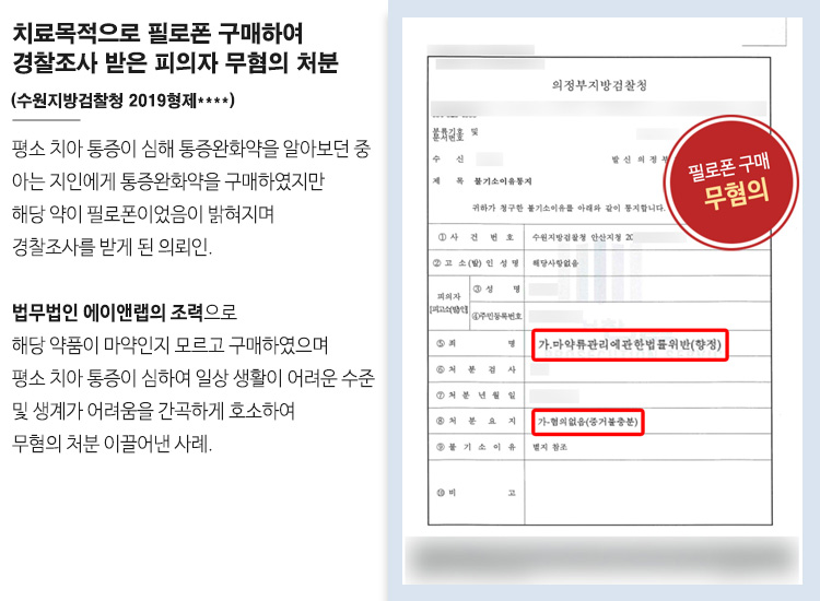 치료목적으로 필로폰 구매하여 경찰조사 받은 피의자 무혐의 처분