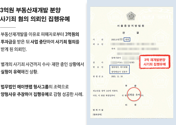 약 3억원의 재개발분양 사기죄혐의의 피고인 변호하여 집행유예로 감형 성공