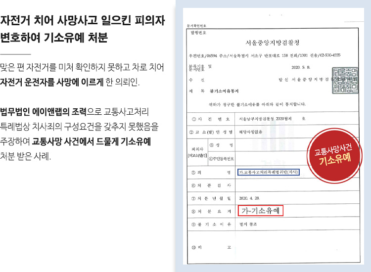 운전 중 자전거 치어 사망에 이르게 한 피의자 변호하여 기소유예