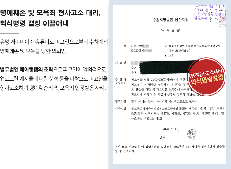 유명 게이머이자 유튜버의 명예훼손 형사고소 대리하여 명예훼손죄 인정받아