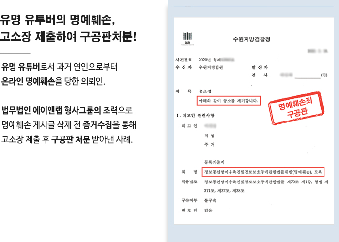 유명 유튜버의 명예훼손에 따른 고소장 제출하여 구공판 처분 이끌어내