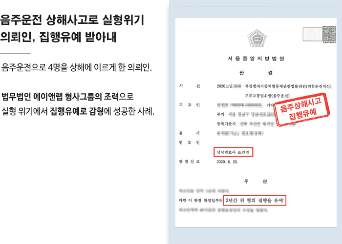 음주운전으로 상해사고 일으킨 피고인 변호하여 집행유예 처분