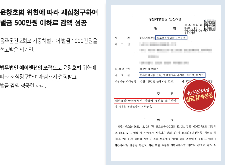 법무법인 에이앤랩은 의뢰인을 대리하여 재심청구를 수행하여 재심개시결정을 이끌어냄으로써 의뢰인이 자신의 음주수치에 맞게 500만 원 이하의 벌금을 받을 수 있도록 하여 벌금이 500만 원 이상 감액되는 결과를 이끌어 냈습니다.