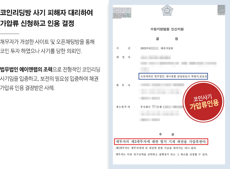 코인리딩방 사기 피해금 보전을 위한 가압류 인용결정