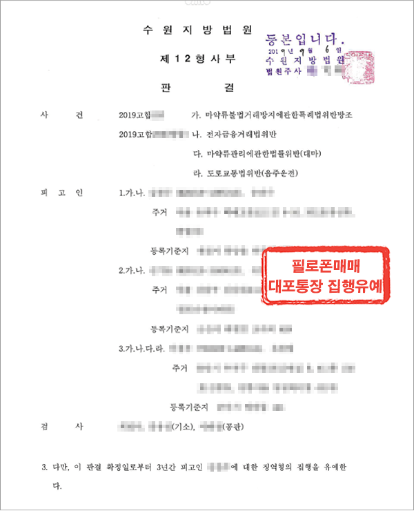 5억 7천만 원 규모의 필로폰 매매에 사용된 통장을 대여한 사건에서 집행유예 판결