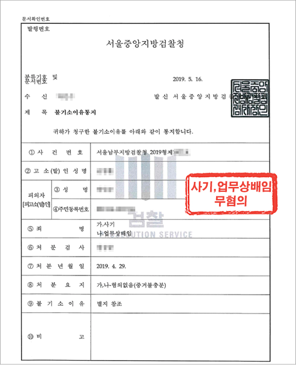 위와 같은 자료 제출 결과, 경찰은 사건을 혐의없음 의견으로 송치하였고, 검찰은 의뢰인에 대한 추가 조사 없이 혐의없음 처분을 하였습니다.