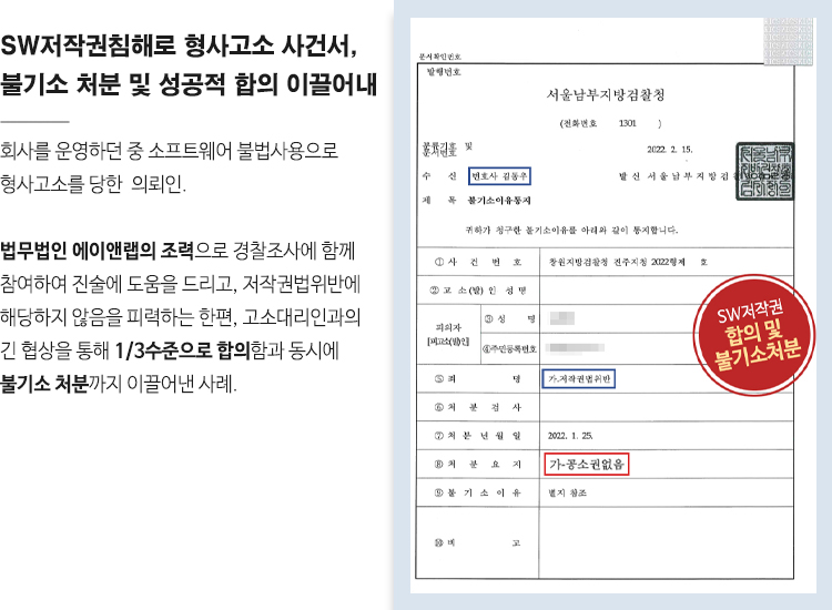 SW저작권침해 형사고소 사건서 손해배상 1/3로 합의 및 불기소 처분 이끌어내